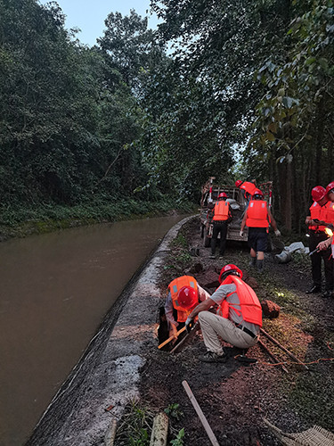 在本次隐患排查中,邛崃站在主干渠19+310处排查发现因渗漏造成的一处隐蔽的坑洞,随后迅速与工程科商定方案,采用混泥土和黏土封闭的方式,于4日晚11点完成应急抢险,工程安全运行。